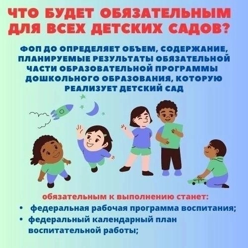 4. Что будет обязательным для всех детских садов? Для всех детских садов будет обязательным объём и содержание обязательной части программы, планируемые результаты освоения образовательной программы, а также федеральная рабочая программа воспитания и календарный план воспитательной работы.