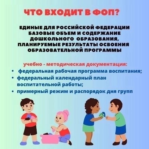 3. Что входит в ФОП (учебно-методическая документация)? В учебно-методическую документацию ФОП входит: федеральная рабочая программа воспитания, федеральный календарный план воспитательной работы, примерный режим и распорядок дня групп. Единые для Российской Федерации базовые объём и содержание дошкольного образования, планируемые результаты освоения образовательной программы.
