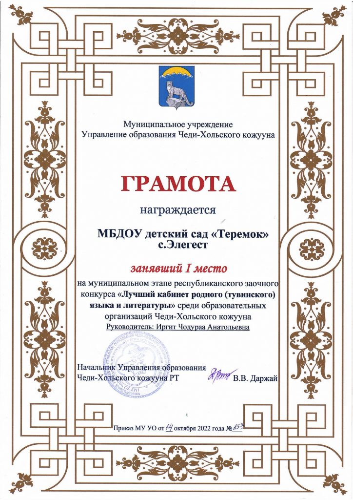 В октябре 2022 года МБДОУ детский сад «Теремок» с.Элегест заняли 1 место на муниципальном этапе республиканского заочного конкурса «Лучший кабинет родного (тувинского) языка и литературы» среди образовательных организаций Чеди-Хольского кожууна.