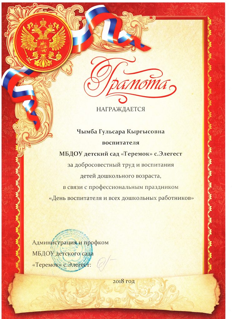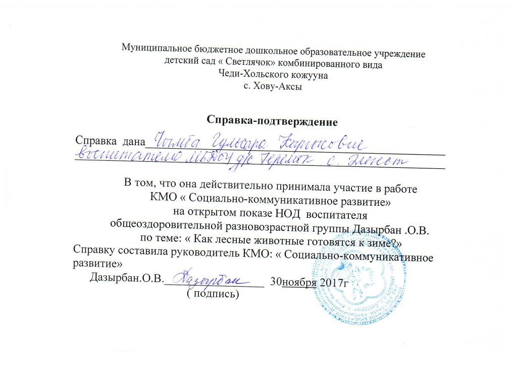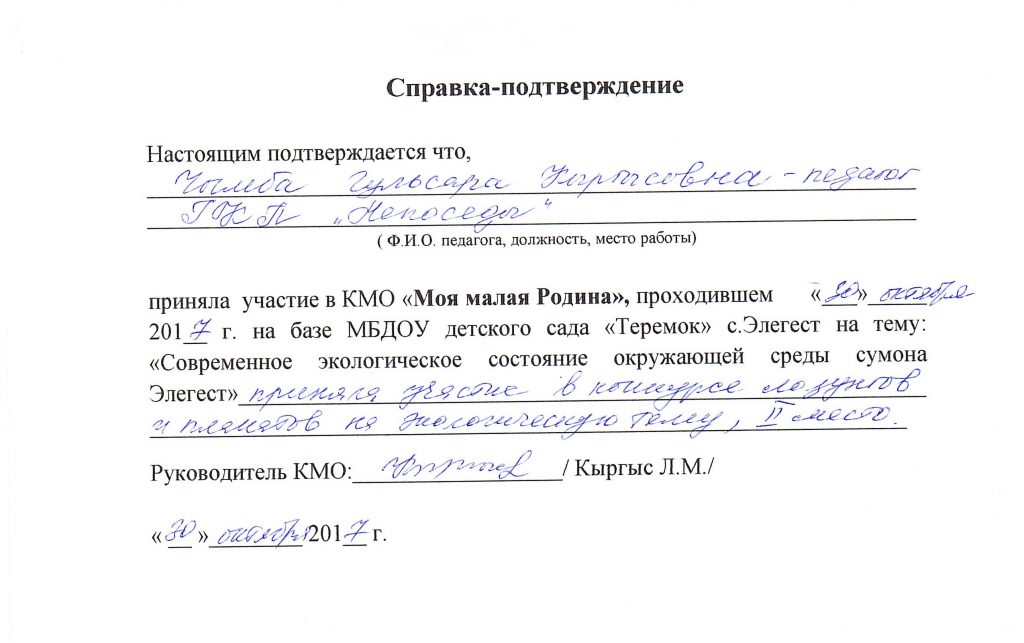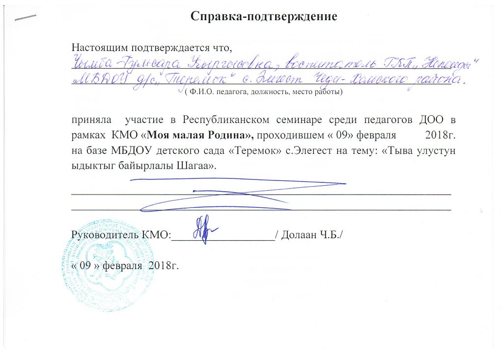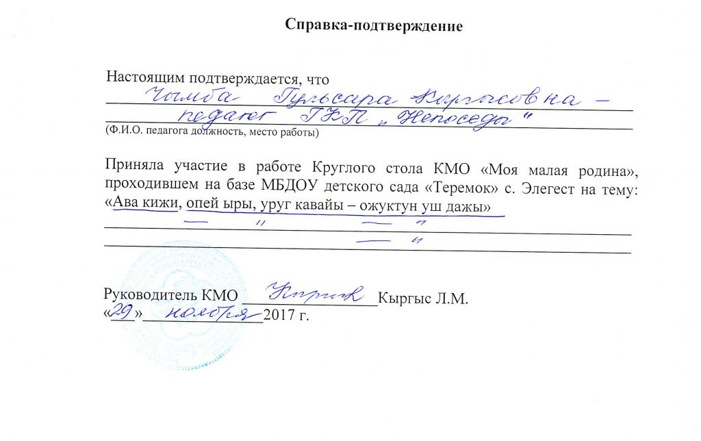 | 3 | Место работы (полное наименование учреждения) | Муниципальное бюджетное дошкольное образовательное учреждение детский сад «Теремок» с.Элегест |