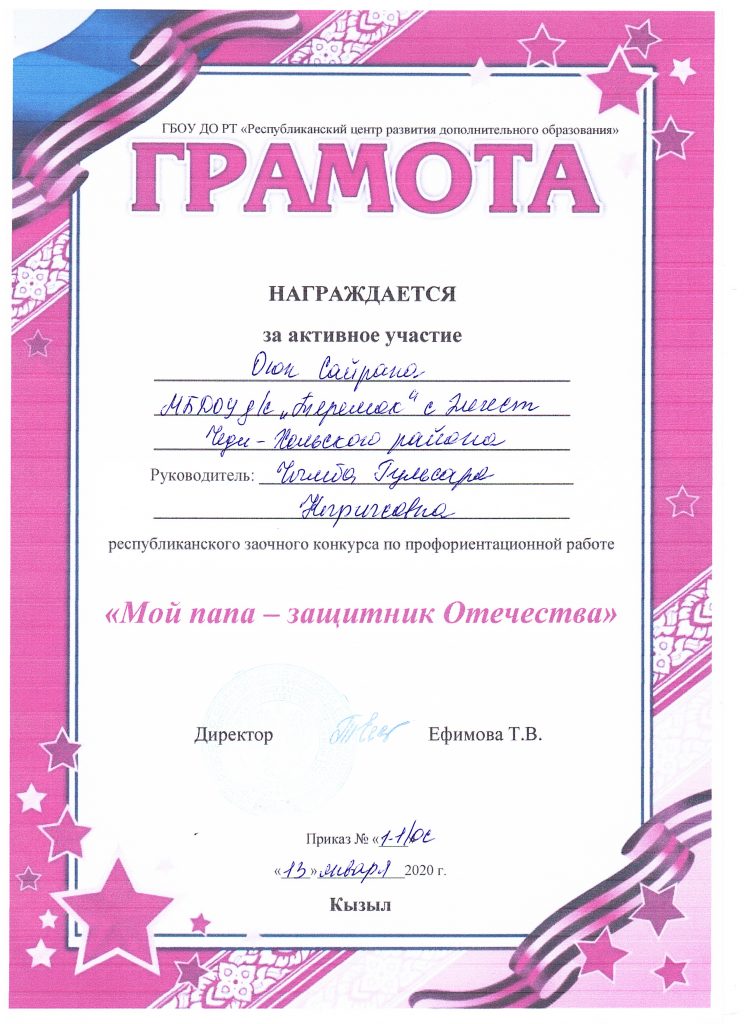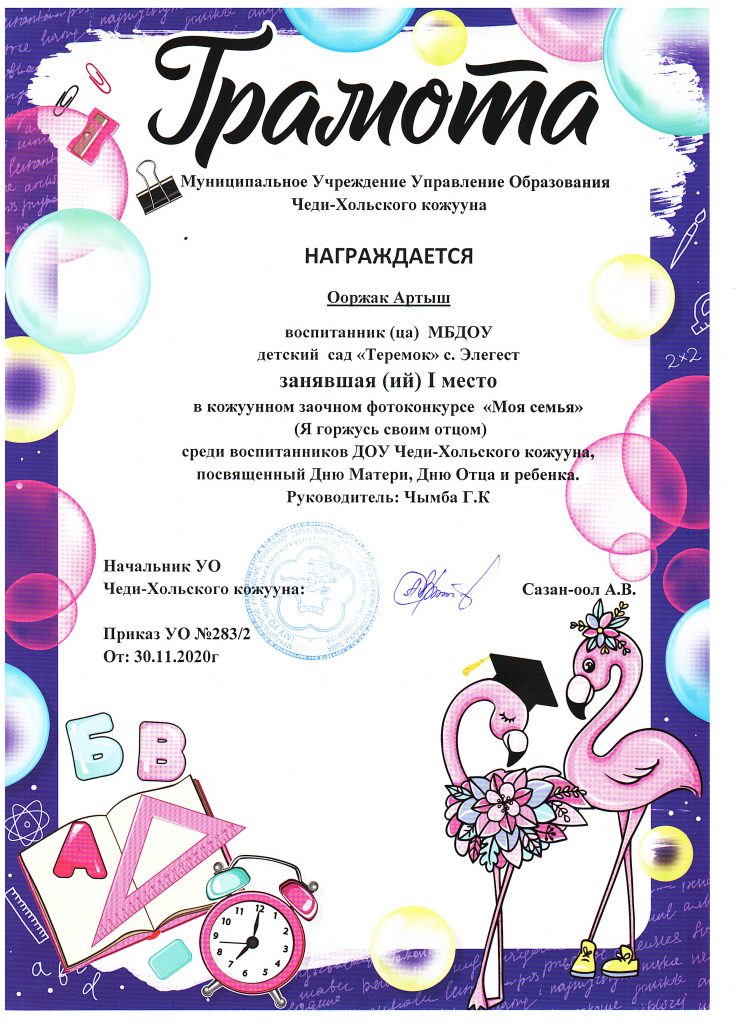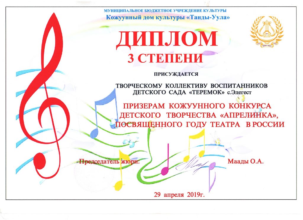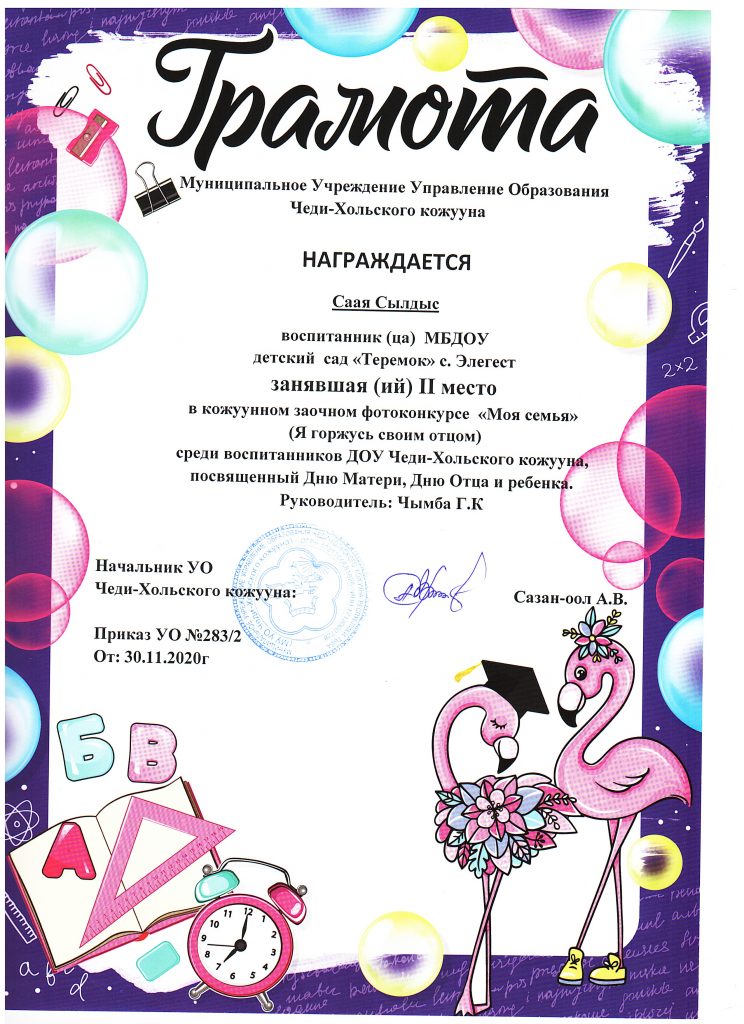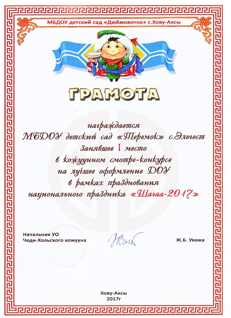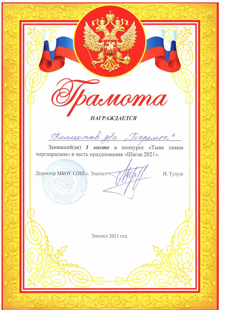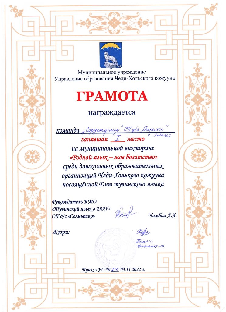 - 2022 года в старшей группе «Солнышко» проводили конкурс «Пальчики оближешь» посвященный Дню Матери, среди родителей и детей группы. Итоги конкурса «Пальчики оближешь», посвященная Дню Матери: 1 место — Ооржак Сенги с мамой, 2 место — Нурсат Сай-Хаан с мамой и 3 место — Долаан Дангынай с мамой. Спасибо за участие!