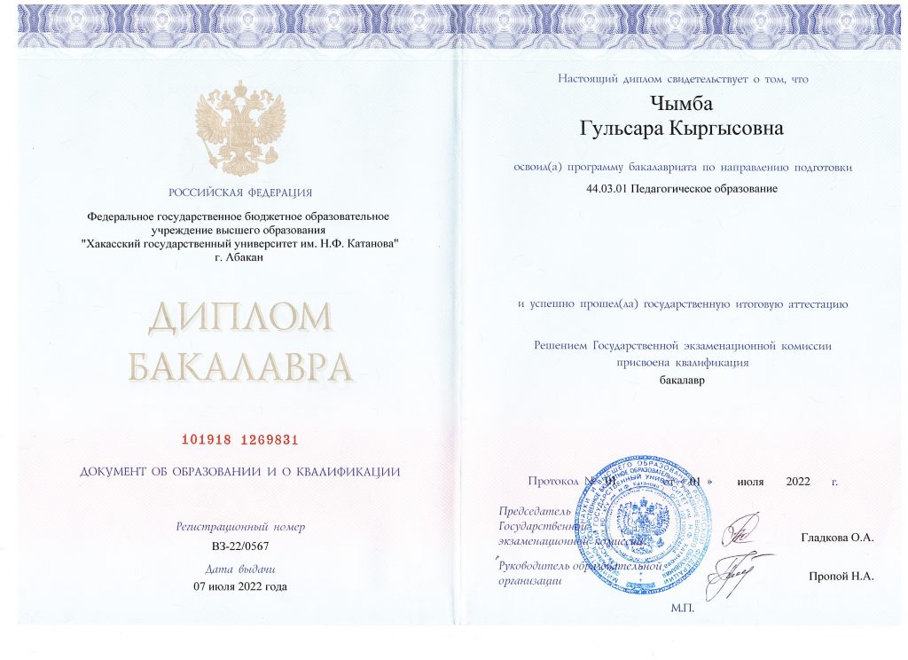 | 2 | Образование, какое учреждение закончил, год окончания | Высшее, Федеральное государственное бюджетное образовательное учреждение высшего образования «Хакасский государственный университет им. Н.Ф. Катанова», 2022 год |