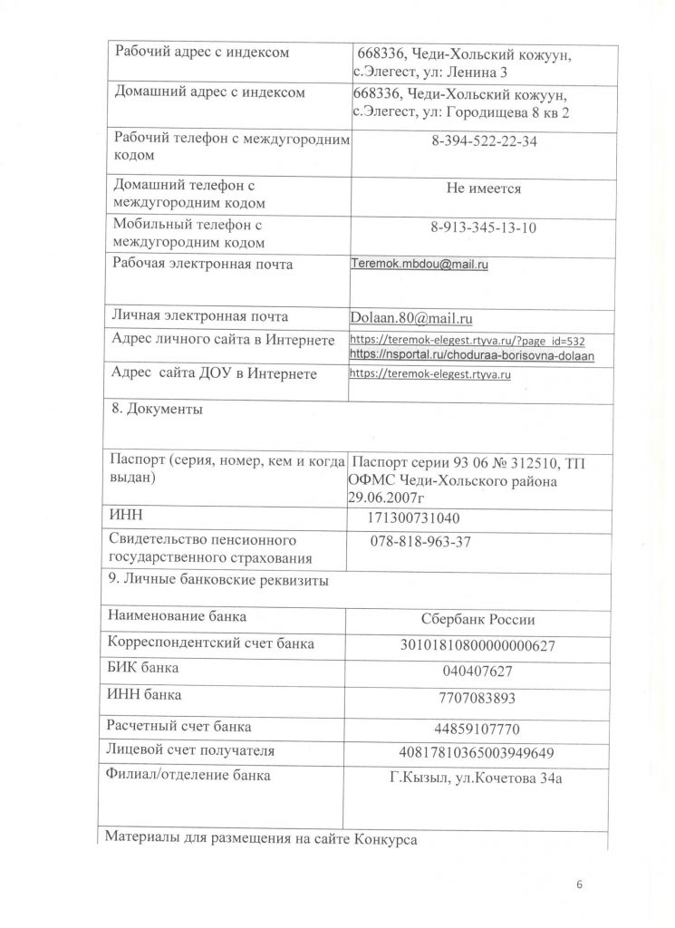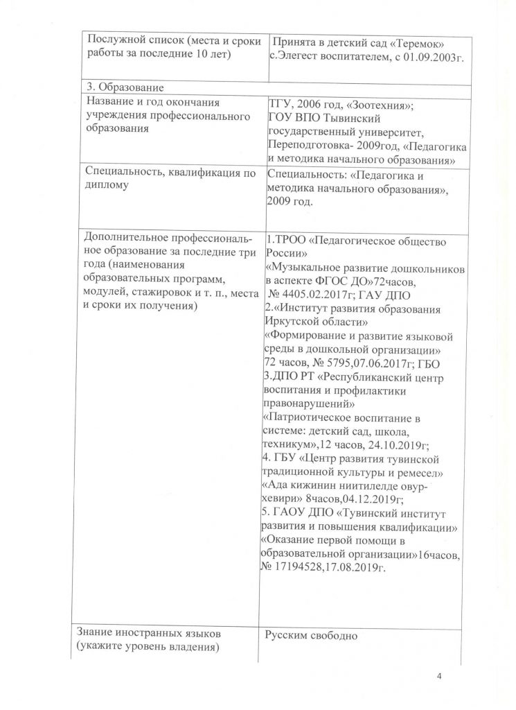 | 3 | Место работы (полное наименование учреждения) | Муниципальное бюджетное дошкольное образовательное учреждение детский сад «Теремок» с.Элегест |